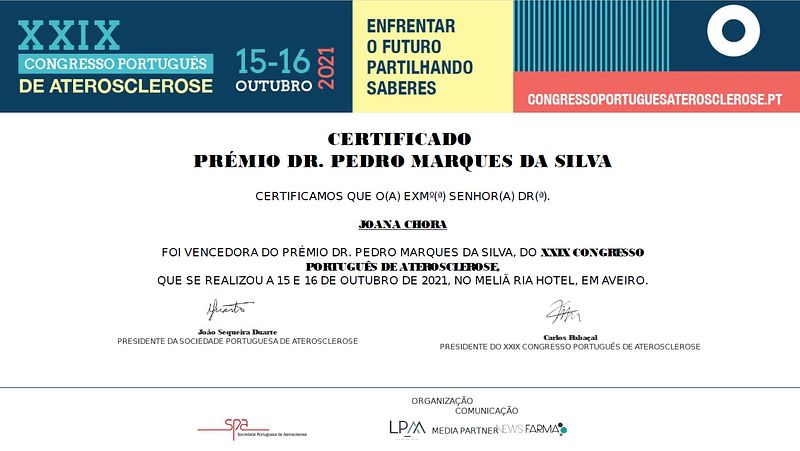 Joana Rita Chora foi distinguida com o Prémio Dr. Pedro Marques da Silva, prémio da melhor comunicação poster no XXIX, que decorreu nos dias 15 e 16 de Outubro, em Aveiro. A distinção foi atribuída ao trabalho intitulado “Cardiovascular risk estimation and management in Familial Hypercholesterolemia patients.”
